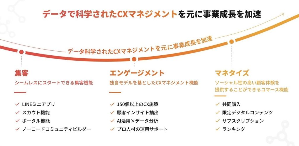 ユーザーの行動を科学しデータ分析でコミュニティ運営課題を可視化。さまざまな機能を活用してCXマネジメントを支援することで顧客とのエンゲージメントを高め、マネタイズ効率を最大化します。